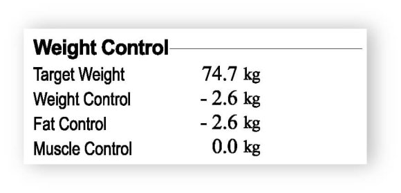 This section (found on the right hand side) makes it incredibly simple to set goals. It is designed to help you reach your ideal body composition. Depending on your current Muscle-Fat balance, this section of the Result Sheet will recommend adjusting fat mass and/or muscle mass in order to reach the target weight.