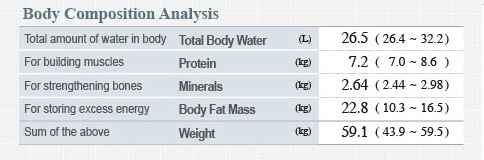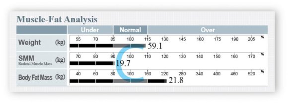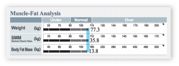 BODY FAT MASS = This is how much body fat you have, and includes both the surface level and internal fat. The Muscle-Fat Analysis also tells you whether you have a healthy balance of SMM and Body Fat Mass in respect to your weight.