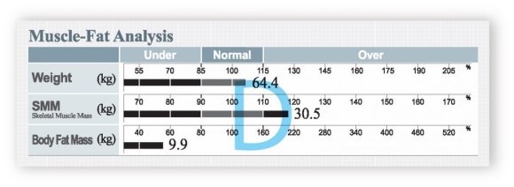 A D-shaped person has a longer Skeletal Muscle Mass bar than both their weight and body fat bars. This is indicative of an “athletic” body type and is considered to be the ideal body composition shape.