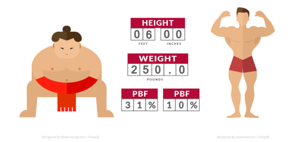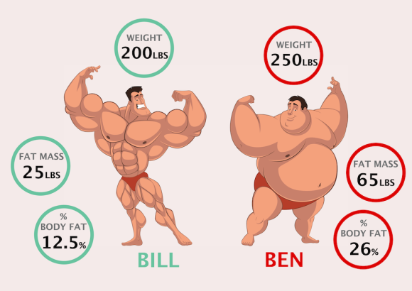 It’s a deceptively simple metric – a division of body fat mass by total weight – but it is a much better indicator of the risk of obesity than BMI. See diagram below which explains why…